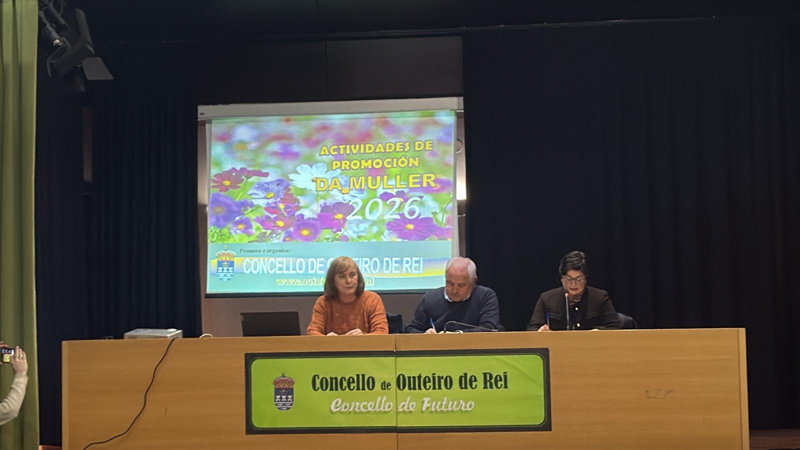 O alcalde de Outeiro de Rei, José Pardo Lombao, a concelleira de Servizos Sociais, Mª José Martínez Vigo e técnica de Desenvolvemento Local do Concello, realizaron o venres a presentación das Actividades de Promoción da Muller 2026.