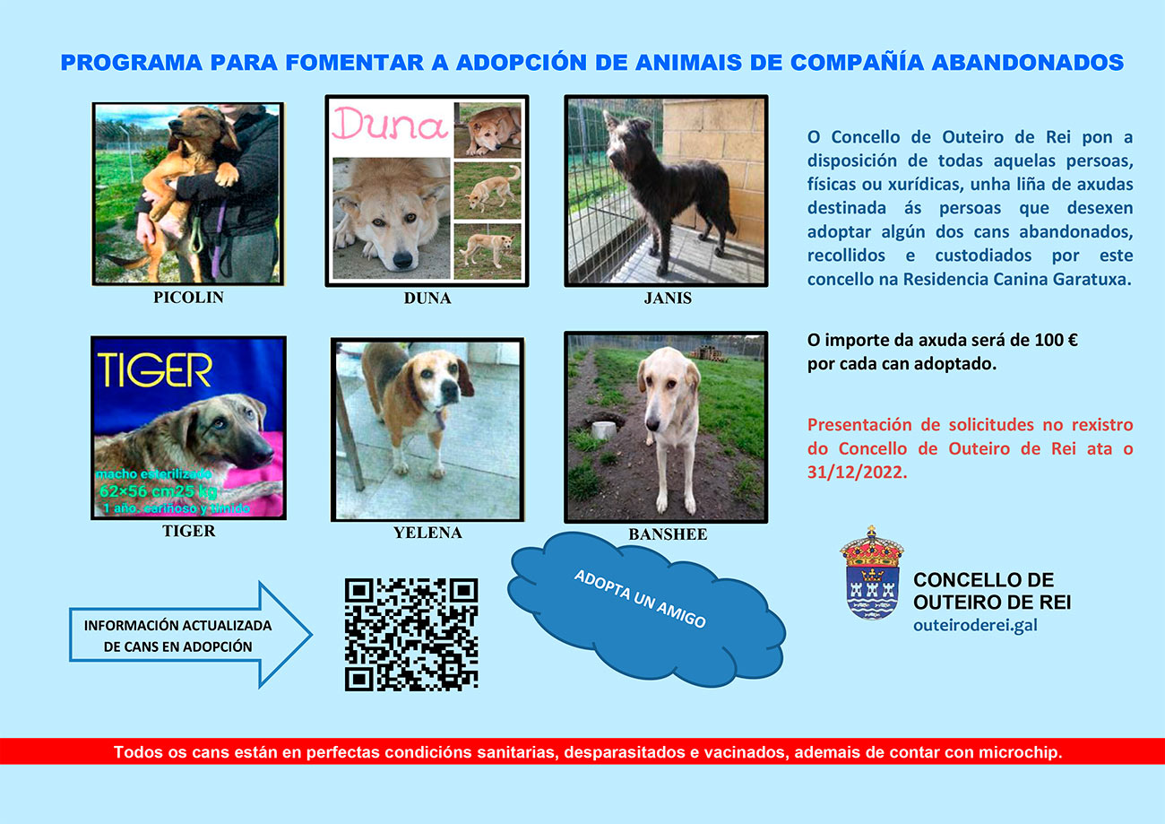 O Concello de Outeiro de Rei convoca unha líña de axudas para todas aquelas persoas que desexen adoptar algún dos cans abandonados recollidos e custodiados polo Concello de Outeiro de Rei na Residencia canina Garatuxa.