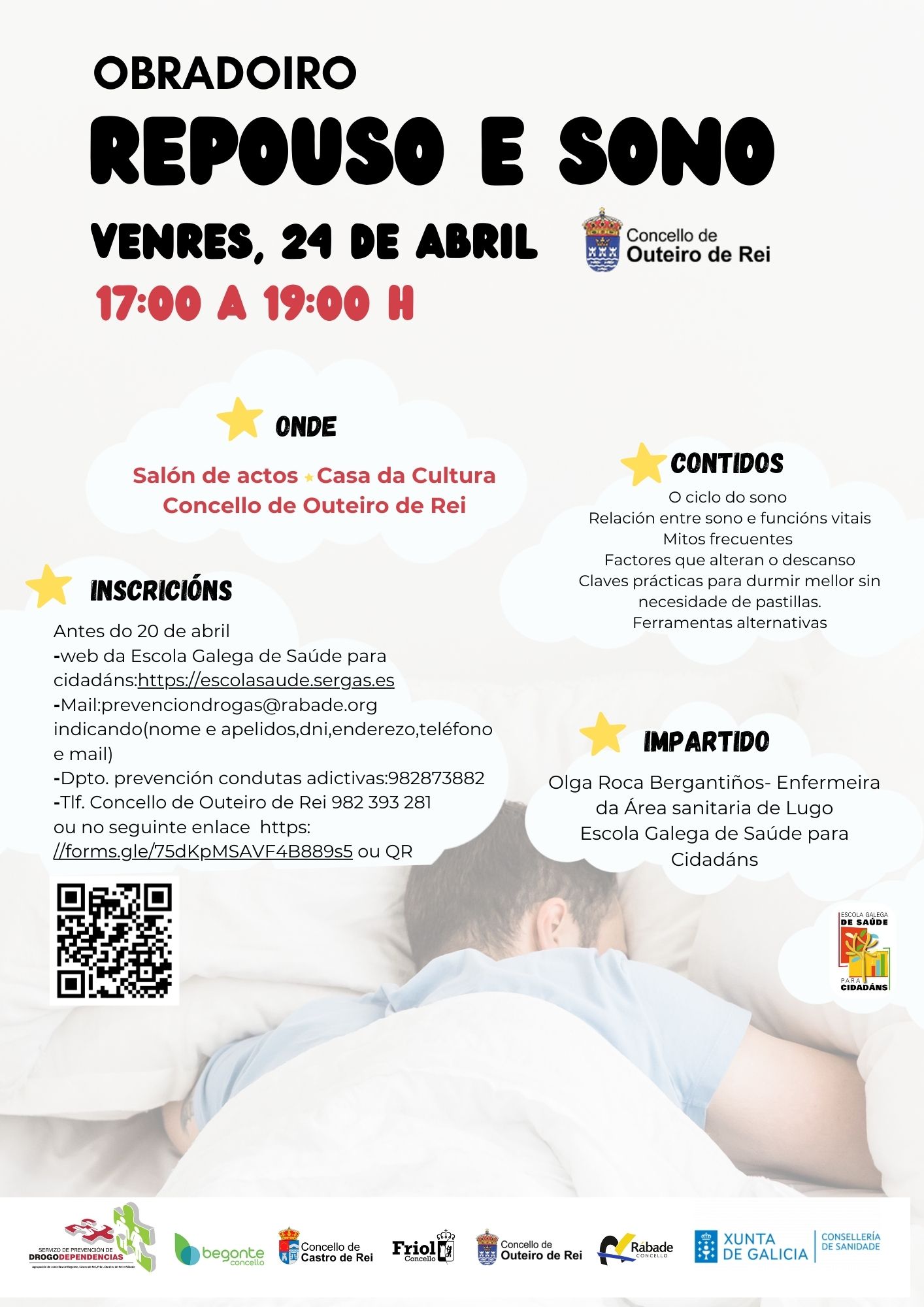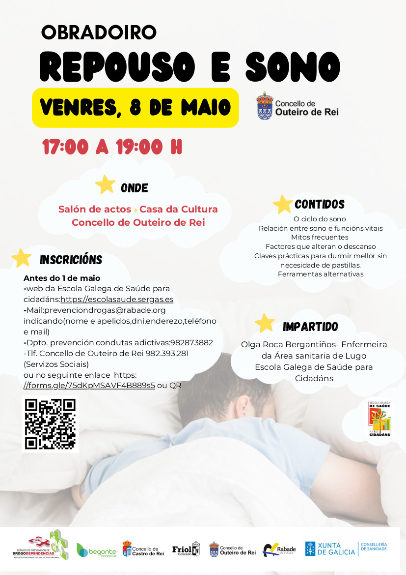 O Concello de Outeiro de Rei a través do Servizo de prevención de Condutas Adictivas da agrupación de Concellos de Begonte, Castro de Rei, Friol, Outeiro de Rei e Rábade organiza unha formación gratuíta sobre repouso e sono dirixido á poboación xeral.