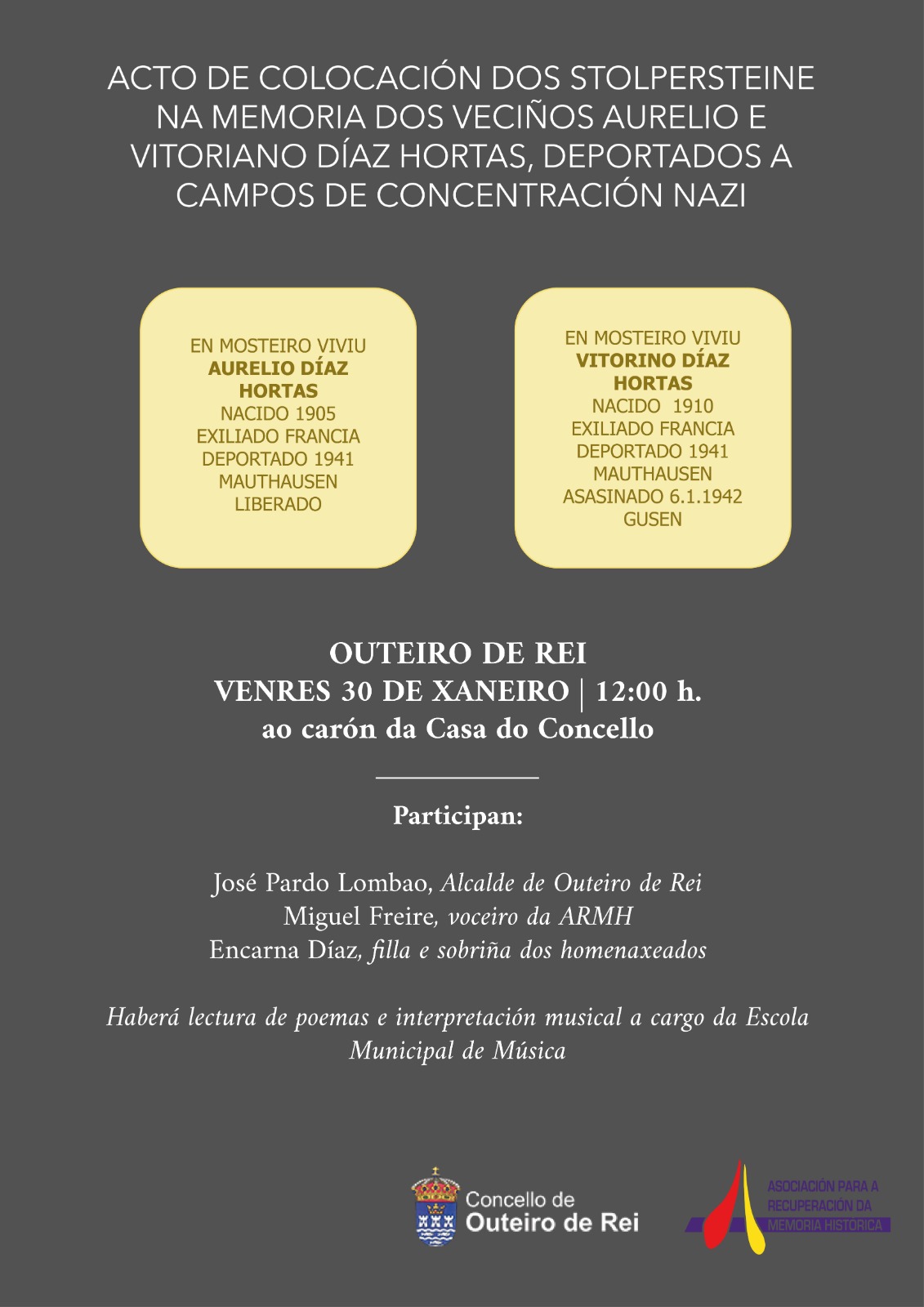O venres día 30 de xaneiro, ás 12 da mañá, terá lugar a colocación dos stolpersteine na honra de Aurelio e Victorino Díaz Hortas, nacidos en Outeiro de Rei e vítimas dos campos de exterminio.