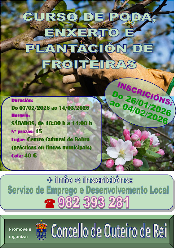 O Concello de Outeiro de Rei organiza de novo un curso de poda, enxerto e plantación de froiteiras que terá lugar, sempre que exista demanda suficiente (un mínimo de 10 solicitudes), do 07 de febreiro ao 14 de marzo de 2026.